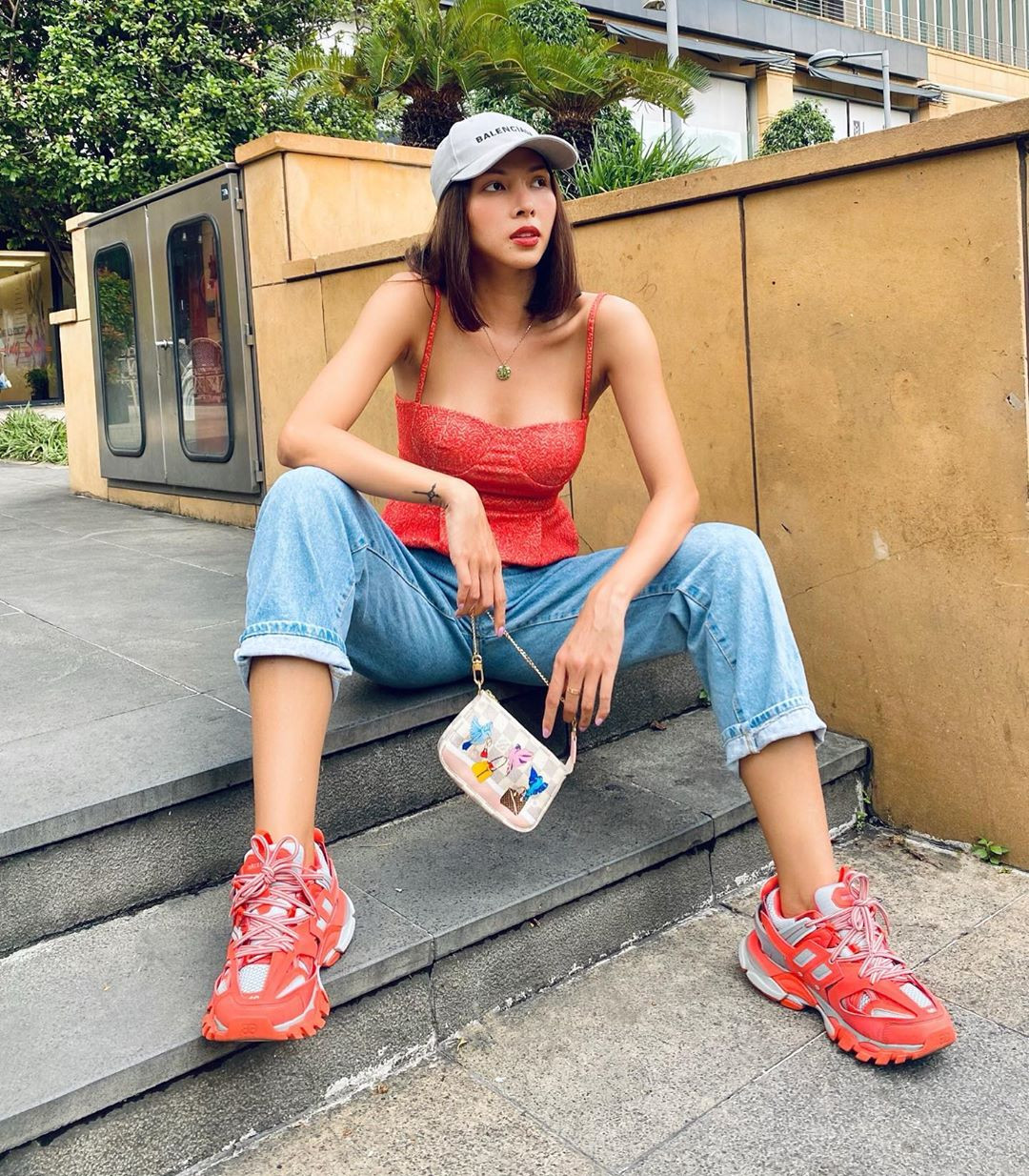 Minh Triệu cực ngầu với áo hai dây và quần jeans baggy năng động, người đẹp chọn giày thể thao cá tính thay vì giày cao gót yêu thích để xuống phố. Khéo léo chọn thêm mũ lưỡi trai và túi xách mini để set trang phục thêm phần bắt mắt.