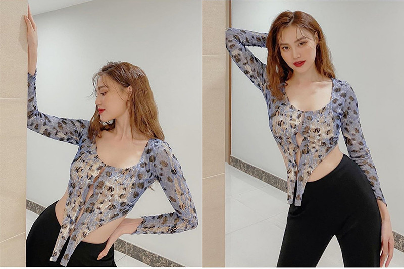 Ninh Dương Lan Ngọc quyến rũ bất ngờ khi chọn áo tay dài cut-out lạ mắt, chất liệu trông vô cùng gợi cảm, mix cùng quần legging lưng cao khoe trọn đường cong cơ thể. Mái tóc xoăn màu nâu và phần trang điểm khá đậm của nữ diễn viên cũng khiến các fan thích thú không kém.