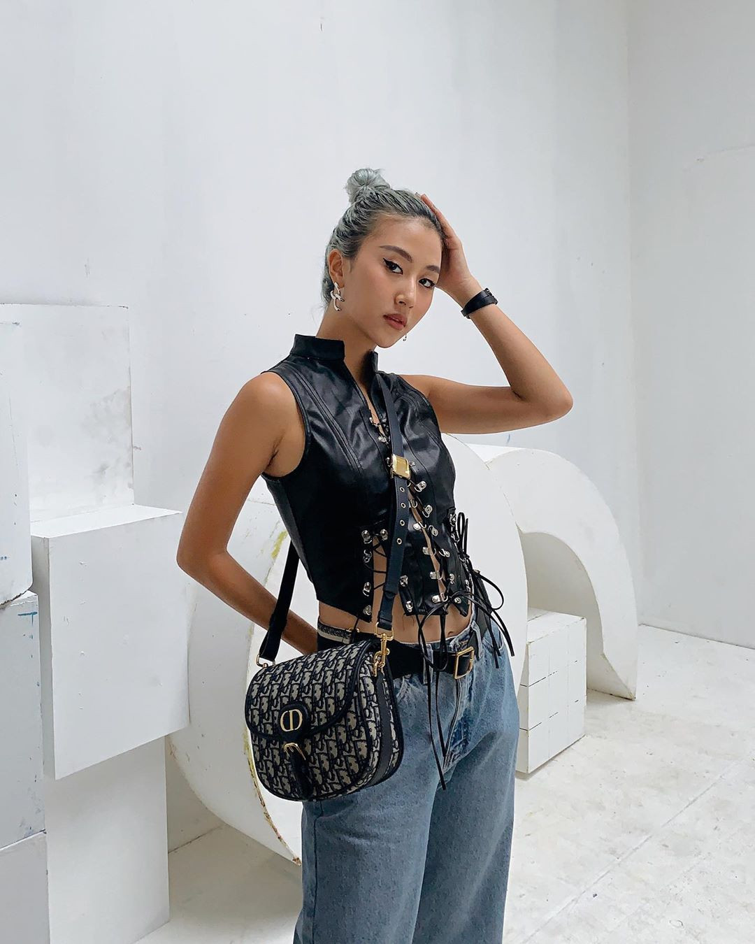 Chọn áo croptop chất liệu da và quần jeans ống rộng thời trang, Quỳnh Anh Shyn khiến người đối diện không thể rời mắt với gu thời trang đẳng cấp, cô nàng mix thêm chiếc túi Dior Bobby đang hot và đồng hồ đeo tay da ton-sur-ton với áo.