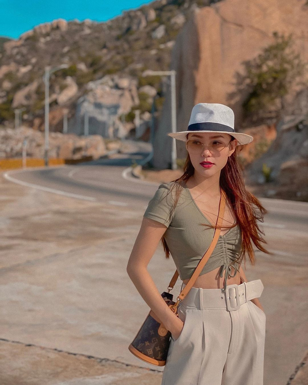 Minh Hằng mix đồ ngày càng lên tay, người đẹp diện áo croptop thắt dây màu rêu khoe vòng eo săn chắc đáng ngưỡng mộ, quần kaki thắt lưng bản to, cùng mũ fedora mát mẻ.