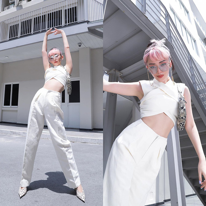 Tóc Tiên với gu thời trang đẳng cấp chưa bao giờ gây thất vọng, nữ ca sĩ chọn cả "cây" đồ trắng với áo croptop đắp tà không tay phối cùng quần baggy, giày cao gót mũi nhọn họa tiết. Người đẹp không quên mix thêm chiếc túi xách da rắn và kính mát hàng hiệu yêu thích.