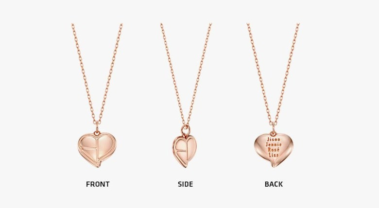 Đầu tiên là mẫu vòng cổ trái tim một mặt in hình logo của BLACKPINK, mặt sau in tên của 4 cô gái xinh đẹp trong nhóm theo thứ tự từ chị cả Jisoo, Jennie, Rosé và cuối cùng là em út Lisa.