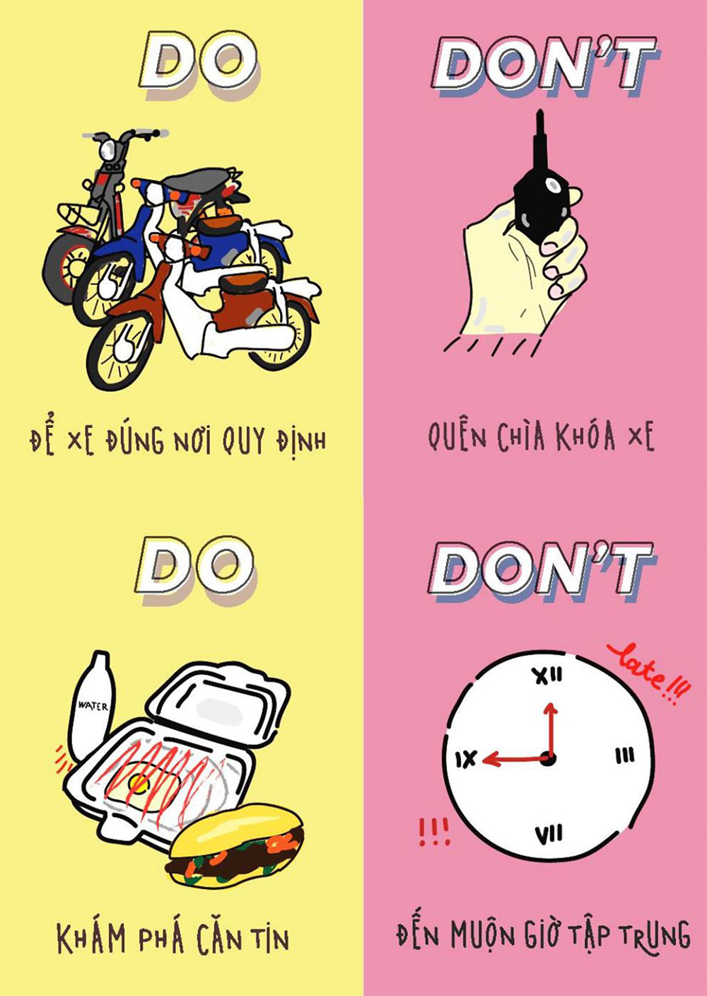 Một “đặc sản” của fanpage trường Kim Liên là những câu chuyện vui được thể hiện qua tranh do chính các bạn ấy thực hiện. Chẳng hạn như bộ tranh “Do and Don’t - Ngày đầu tới trường của K46” là lời nhắc nhở các “lính mới” nên làm và không nên làm gì đầy hài hước và tình củm.