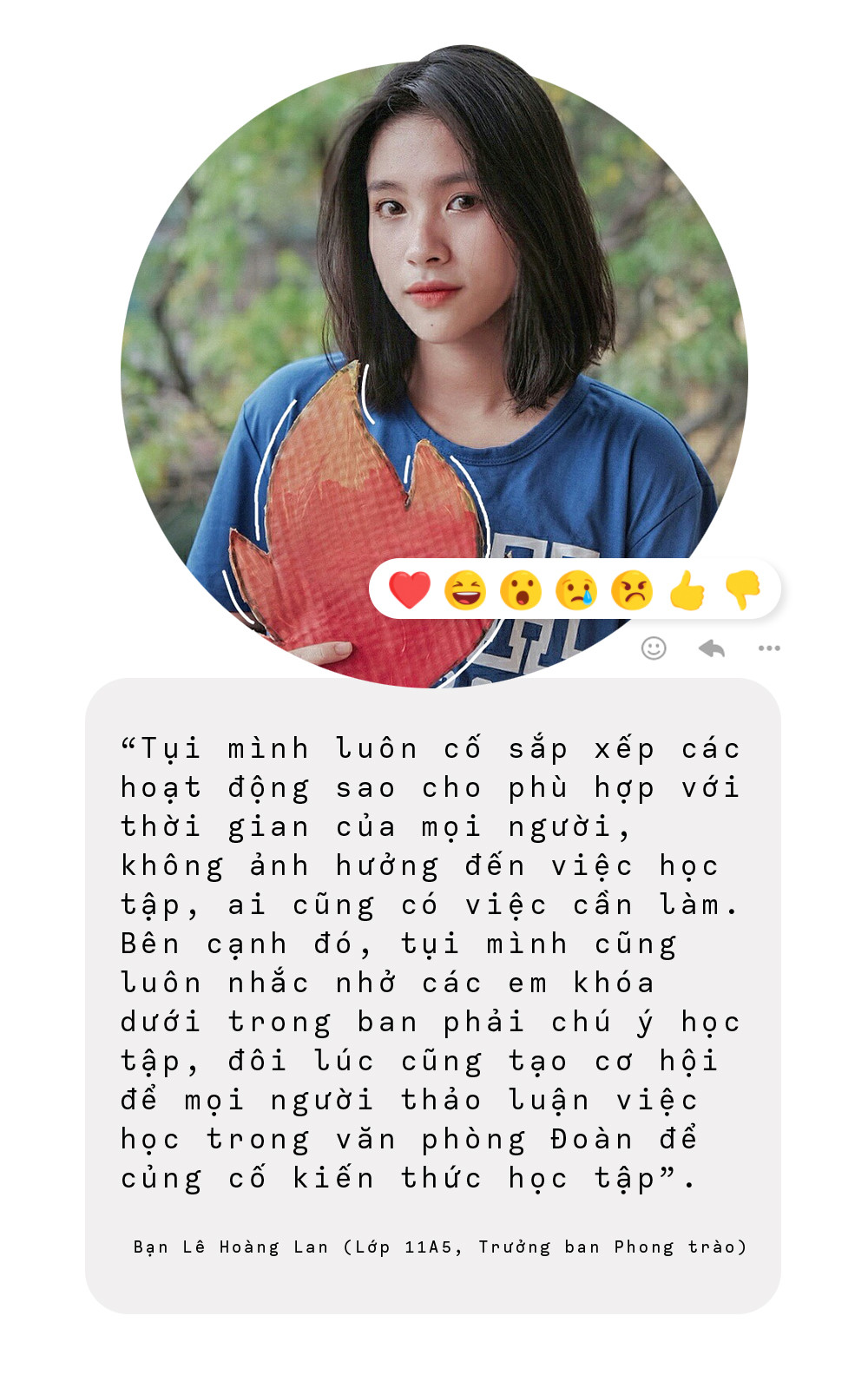 Bạn Dương Hồng Anh (Lớp 11A3, Phó Bí thư Đoàn trường THPT Kim Liên) chia sẻ: “Thỉnh thoảng cũng có một số điều cô và trò chưa hiểu ý nhau, nên chúng tớ và cô sẽ cùng trao đổi kỹ hơn về ý tưởng. Chúng tớ còn trẻ, có nhiều điều chưa nghĩ được sâu sắc như người lớn, cô phân tích cho chúng tớ xem cái gì nên, cái gì không nên. Chúng tớ được thoải mái thể hiện và cũng thoải mái tiếp thu ý kiến”.