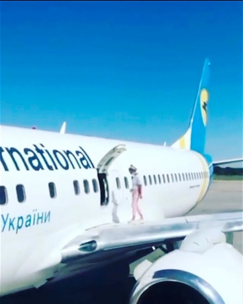 Đây là một phụ nữ người Ukraine vừa đi nghỉ ở Thổ Nhĩ Kỳ về. Máy bay vừa hạ cánh xuống sân bay Boryspil ở Kyiv (Ukraine) thì cô vội vàng xông ra khỏi chiếc máy bay Boeing 737-86N (qua cửa thoát hiểm), ngồi trên cánh máy bay một chút rồi đứng dậy đi đi lại lại.