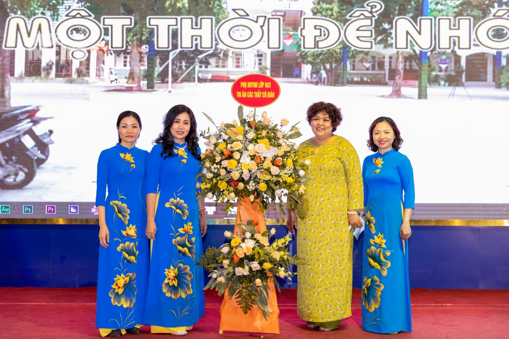 Ban phụ huynh nhà trường tặng hoa nhà trường trong buổi lễ ra trường đầy xúc động.