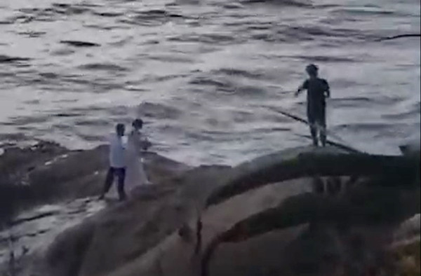 Điều gì phải đến đã đến. Chỉ một khoảnh khắc sau đó, cả cô dâu lẫn chú rể bị cuốn tít ra biển. Người quay phim la lên: “Trời đất ơi” rồi mọi người chạy đi gọi cứu hộ.