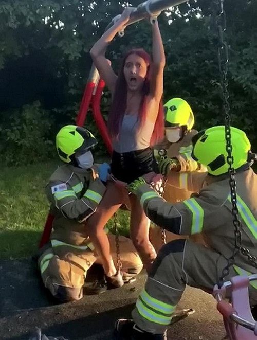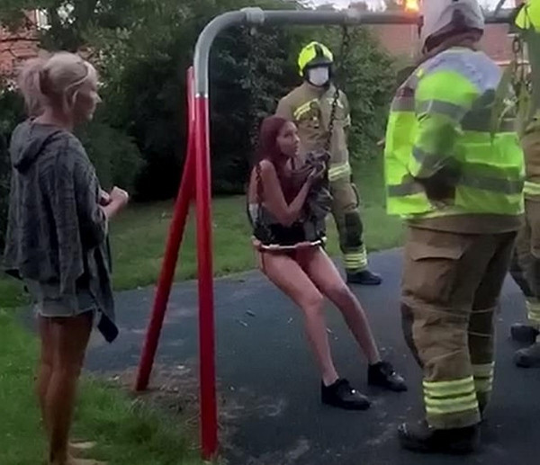 Layani Maclean, nữ TikToker 14 tuổi, đã lấy tay che mặt vì xấu hổ khi đội cứu hộ phải tới để “giải cứu” bạn ấy ở sân chơi của trẻ con tại Faringdon (Oxfordshire, Anh). Lý do là vì Layani cố ngồi vào cái xích đu bé xíu để quay video, rồi không thể ra được nữa.