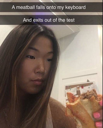 Trong bài kiểm tra hôm nay em đã gặp phải những khó khăn về kỹ thuật và các tình huống bất ngờ ngoài dự kiến làm ảnh hưởng tới kết quả. Một cái gì đó đã rơi vào máy tính của em và nộp bài thi khi em mới hoàn thành chưa được một nửa số câu hỏi. "Cái gì đó" mà em nói đến là miếng thịt viên, nó đã rơi ngay vào bàn phím khi em đang làm bài kiểm tra. Miếng thịt đã gây ra vài lỗi trên laptop của em và nộp bài thi khi em chưa hoàn thành xong".