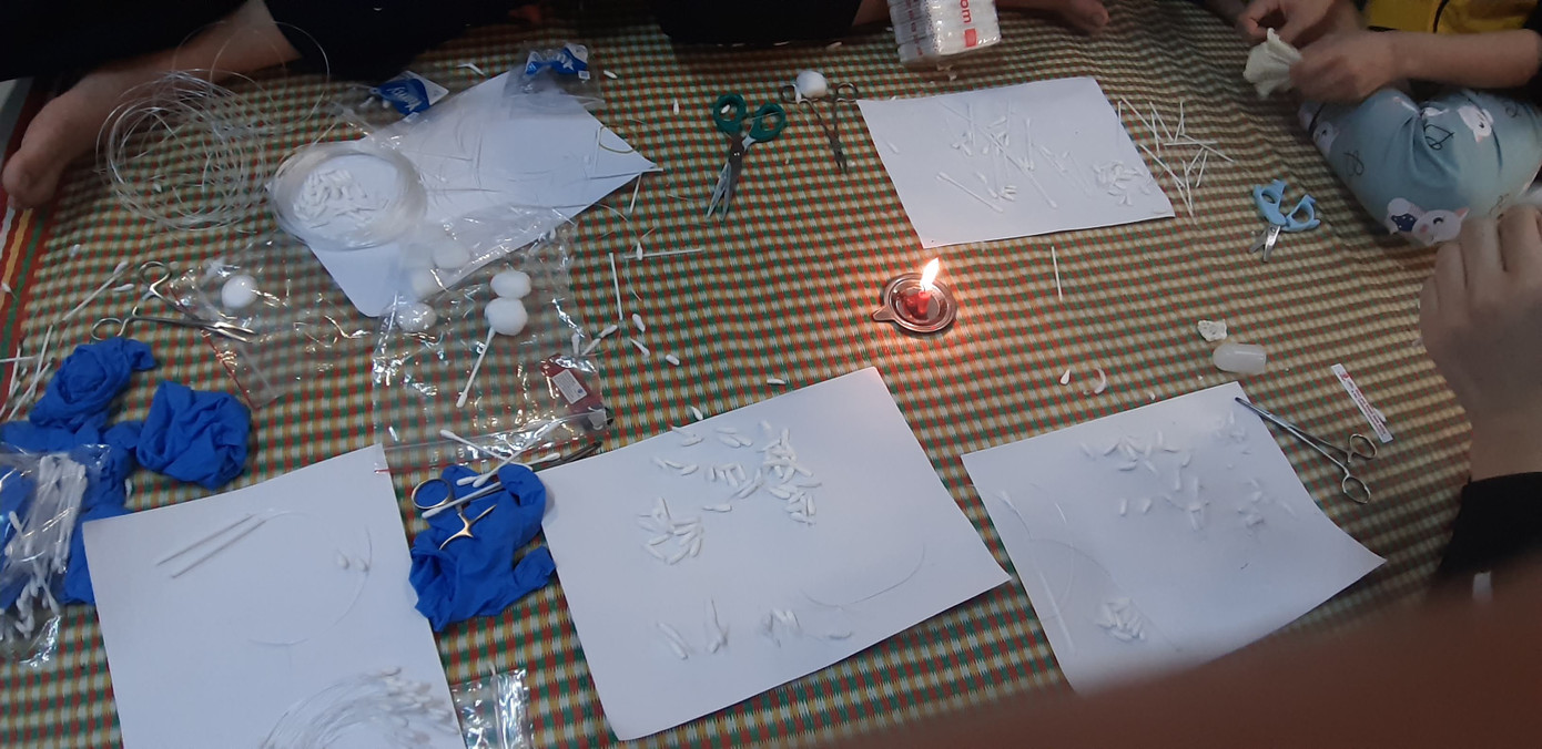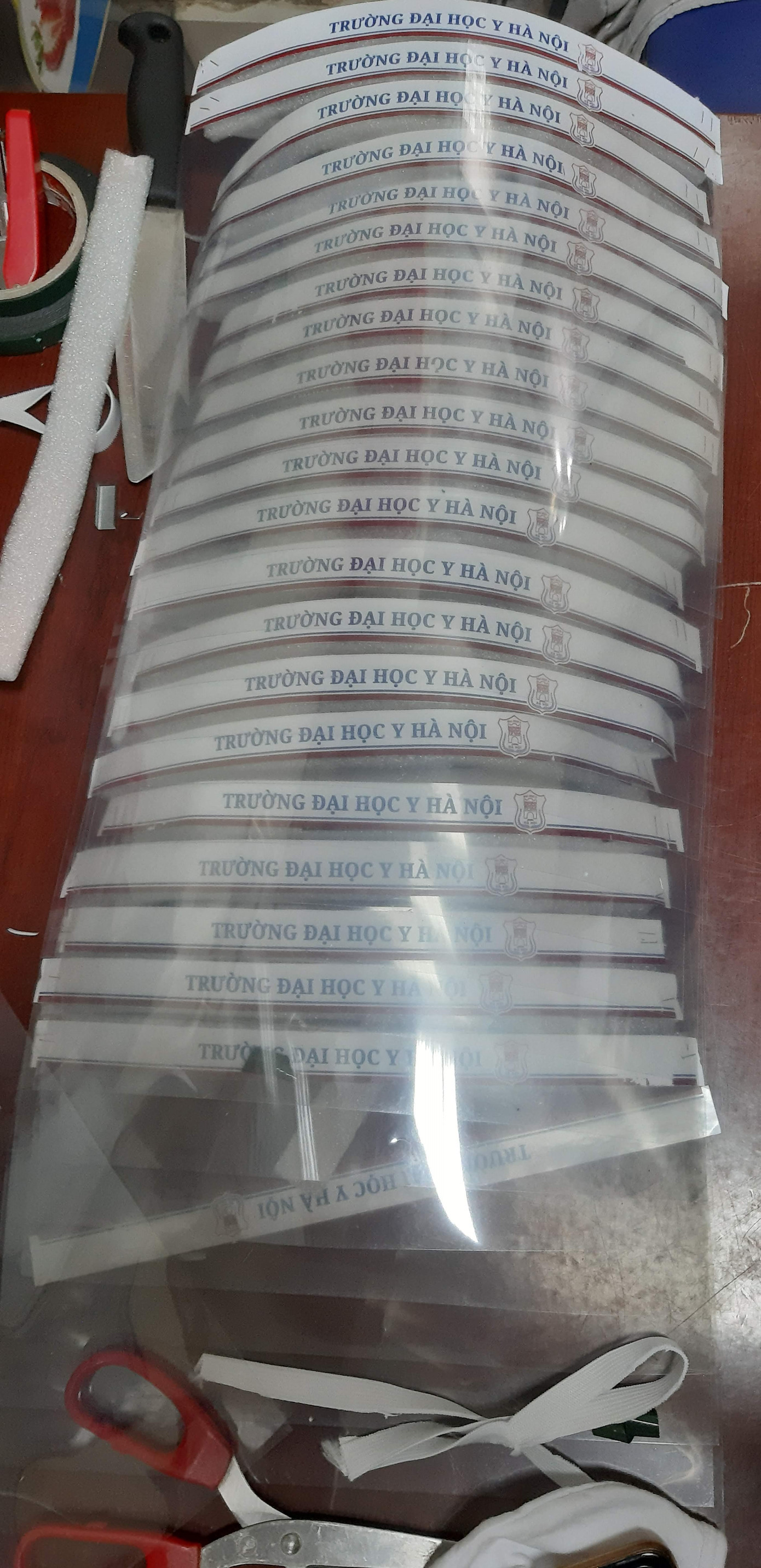 Dụng cụ làm tấm kính chống giọt bắn. Chiến dịch tình nguyện lần này chia làm 2 đợt: Đợt 1 huy động làm 1000 que lấy mẫu xét nghiệm ngày 9/4, đợt 2 làm 500 tấm chắn giọt bắn phát động bắt đầu vào ngày 11/4. Tất cả các sinh viên tham gia đều được giao nguyên liệu và thực hiện tại nhà, đảm bảo không tiếp xúc trực tiếp trong thời gian cách li.