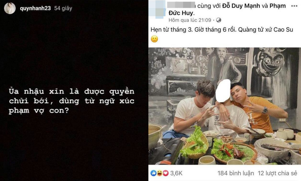 Trước đó, vào ngày 10/5, Quỳnh Anh bất ngờ đăng lên phần story của Instagram - "Nhậu xỉn là được quyền chửi bới, dùng từ ngữ xúc phạm vợ con?" khiến người hâm mộ cảm thấy quá đỗi ngỡ ngàng. Được biết, trong tối cùng ngày, Duy Mạnh đã đi ăn, uống cùng với Đức Huy và một số bạn bè khác.