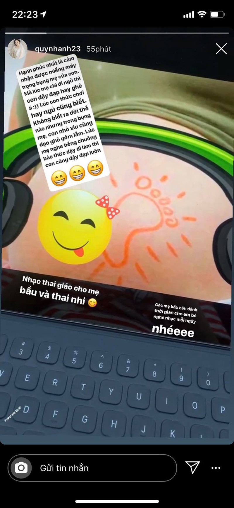 Thế nhưng, trái với sự "nóng ruột" của người hâm mộ, Quỳnh Anh mới đây vẫn thản nhiên đăng story cô đang cho em bé nghe nhạc. Có vẻ như nghi vấn vợ chồng lục đục không mấy ảnh hưởng tới tâm trạng của Quỳnh Anh.