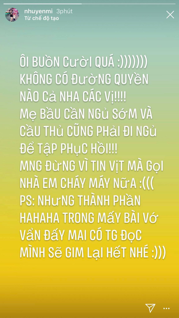 "Ôi buồn cười quá. Không có đường quyền nào nha các vị. Mẹ bầu cần ngủ sớm mà cầu thủ cũng phải đi ngủ để tập phục hồi! Mọi người đừng vì tin vịt mà gọi nhà em cháy máy nữa. P/s: Những thành phần hahaha trong mấy bài vớ vẩn đấy mai có thời gian đọc mình sẽ ghim lại hết nhé!".