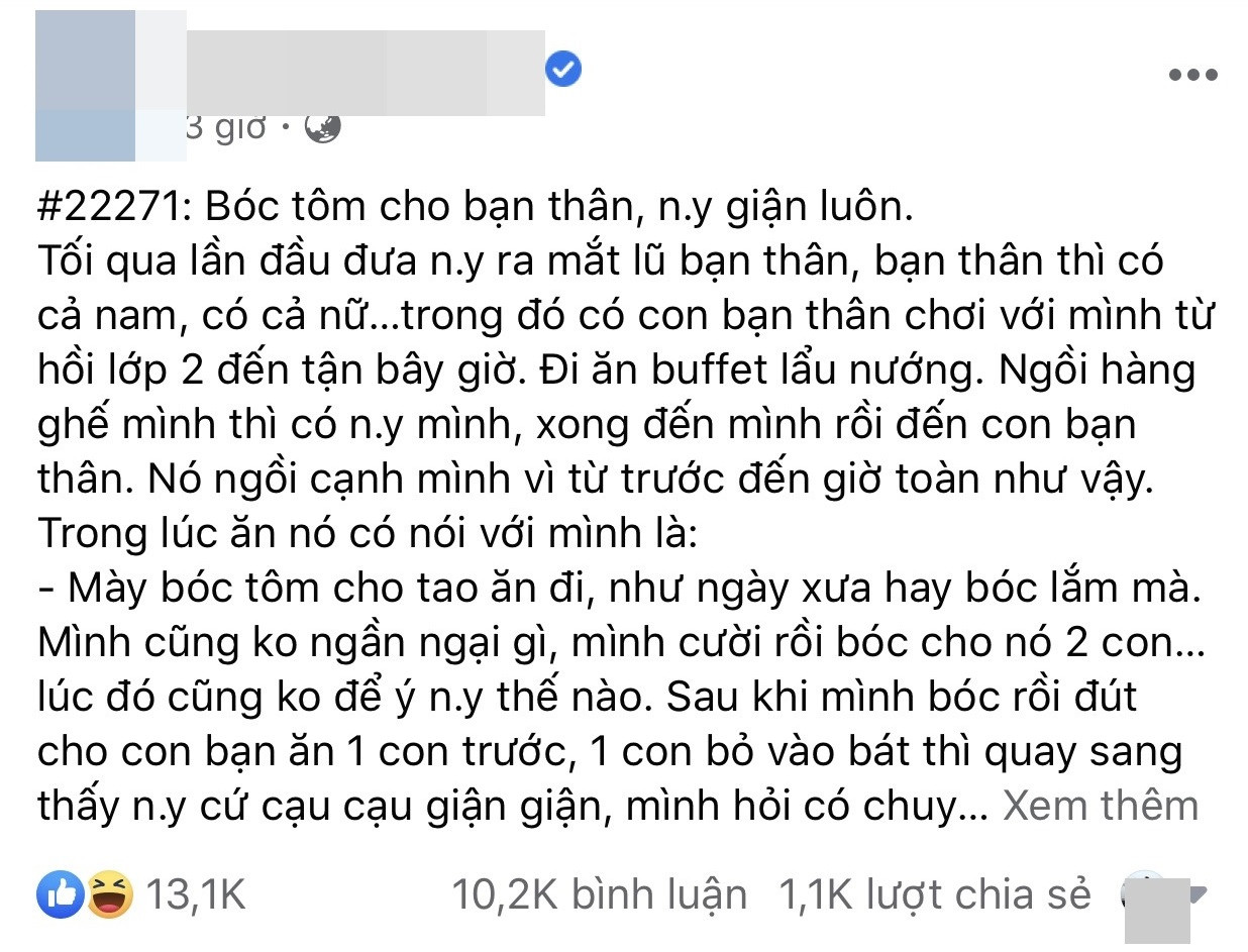Đụng trúng cái gai trong mắt 500 chị em khi bàn đến chủ đề không bao giờ "nguội", bài chia sẻ đã ngay lập tức nhận được về lượng tương tác khủng, với hàng nghìn lượt bình luận và chia sẻ. Hầu hết, netizen đều lên lên tiếng bức xúc thay cho người yêu anh chàng, và "ném đá" cô bạn thân khi không giữ ý tứ mà nói: "Bóc tôm cho mình ăn đi, như ngày xưa hay bóc lắm mà".