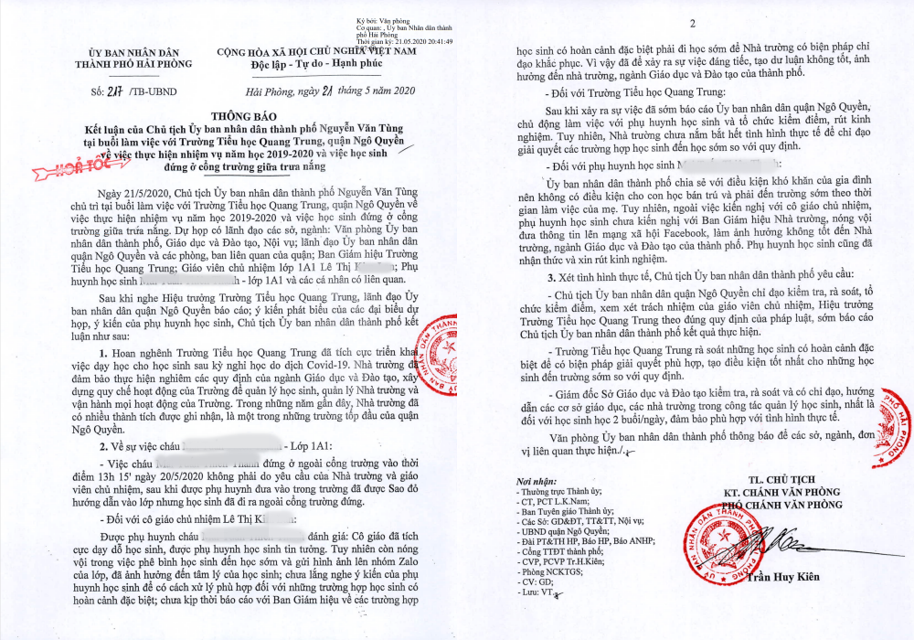 Ngay sau đó, UBND TP. Hải Phòng, Sở GD&ĐT Hải Phòng cùng Ban Giám Hiệu trường Tiểu học Quang Trung đã vào cuộc xác minh và xử lý vụ việc. Trong cuộc họp báo vào chiều ngày 21/5, mẹ của em bé - chị M. đã tỏ ra vô cùng bức xúc, phẫn nộ. Chị M. chia sẻ trong cuộc họp báo: "Thiết nghĩ, nếu tôi không quay lại và phản ánh, có thể, con tôi sẽ ngày nào cũng ra đứng ở cổng trường".