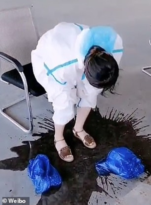 Nữ nhân viên y tế này được cho là đang nghỉ ngơi một chút sau ca làm việc chống COVID-19 ở Urumqi (Tân Cương, Trung Quốc). Cô ngồi lên một cái ghế để gỡ bỏ lớp đồ bảo hộ bằng nylon màu xanh, bọc bên ngoài giày. Thế rồi cô nhấc cái quần bảo hộ lên và mồ hôi đổ ra như trút, theo tờ Nhân Dân Nhật Báo. Nhiệt độ ngoài trời lúc đó là khoảng 29oC.