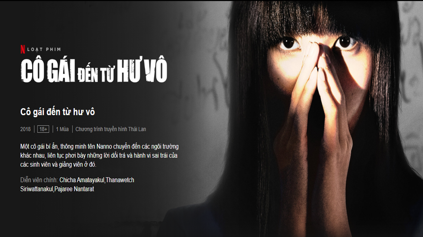 Girl From Nowhere (tên Tiếng Việt: Cô gái đến từ hư vô) là một series gồm 13 tập được phát hành trên Netflix vào năm 2018. Mỗi tập phim đều xoay quanh cô gái bí ẩn Nanno (do Chicha Amatayakul đảm nhận) nhìn bên ngoài xinh đẹp, đáng yêu, nụ cười dễ mến nhưng bên trong đầy bí hiểm, khó đoán. Cô gái này là nỗi ám ảnh kinh hoàng ở trường học khi mỗi lần chuyển trường, những lời nói dối và hành vi của các học sinh và giáo viên ở đó đều được cô vạch trần. Người xem không khỏi bàng hoàng, “há hốc” trước những góc tối sâu thẳm bên trong con người: Ham muốn, đố kỵ, lòng tham… được phô diễn trong mỗi tập phim của Girl From Nowhere.