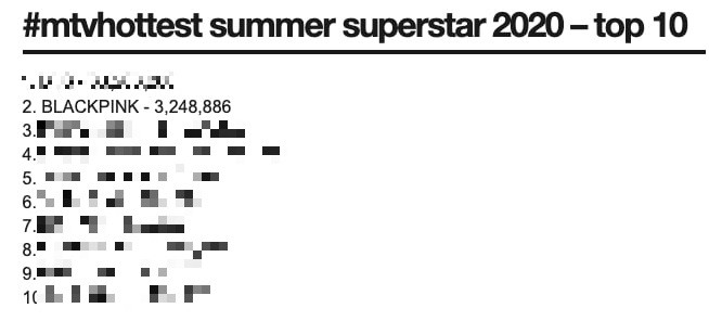 Trước đó, vào ngày 29/8 (theo giờ địa phương tại Anh), BLACKPINK cũng đã đạt ngôi Á quân tại cuộc bình chọn thường niên Hottest Summer Superstars 2020 của MTV UK với 3,248,886 vote.
