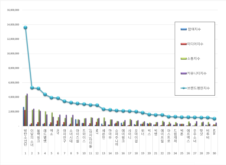 Như một điều quen thuộc, BTS tiếp tục dẫn đầu BXH tháng này với 13.605.781 điểm. Các cụm từ xếp hạng cao trong phân tích từ khóa của nhóm gồm “ON”, “YouTube” và “promise”. Trong khi đó, các thuật ngữ liên quan đến xếp hạng cao nhất của BTS là “appear”, “root for” và “act” (xuất hiện, ủng hộ, hành động). Phân tích tính tích cực - tiêu cực của BTS cũng cho thấy số điểm phản ứng tích cực là 62,84%.