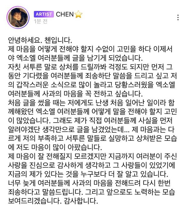 Sau hơn một tháng công khai tin kết hôn, Chen vẫn bị khán giả Hàn tẩy chay dữ dội và vì thế mà vào ngày 21/2, anh chàng viết thêm tâm thư nữa để xin lỗi fan. Bức thư này được đăng tải trên ứng dụng Lyns dành riêng để các nghệ sĩ nhà SM trò chuyện với khán giả. Chen nói lời xin lỗi tất cả những người đã bất ngờ, ngạc nhiên với thông báo kết hôn quá đột ngột.