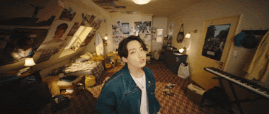 Trong MV Dynamite, các thành viên của BTS hầu như đều có cảnh quay solo. Cảnh quay solo của Jung Kook là ở trong một căn phòng gác mái với khung cảnh phòng ngủ đặc trưng của một chàng trai mới lớn hồi những năm 80 - 90 thế kỷ trước: Tường nhà dán đầy poster của các ca sĩ và nhóm nhạc huyền thoại, trong phòng kiểu gì cũng có phải có một cây guitar, máy nghe nhạc cassette đặt trên bàn học... Jung Kook mặc bộ jeans của Louis Vuitton, đi giày Timberland, uống sữa nhảy nhót đúng chuẩn một chàng trai mới lớn.