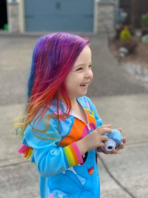 Dù chưa biết gì nhiều nhưng rụng hết tóc là điều khiến Olivia lo lắng nhất. Để an ủi con gái, cô Lori - mẹ của Olivia - gợi ý nhuộm tóc cô bé thành một màu ngộ nghĩnh gì đó rồi chụp ảnh làm kỷ niệm. Olivia đồng ý, nhưng cô bé muốn… tất cả các màu.