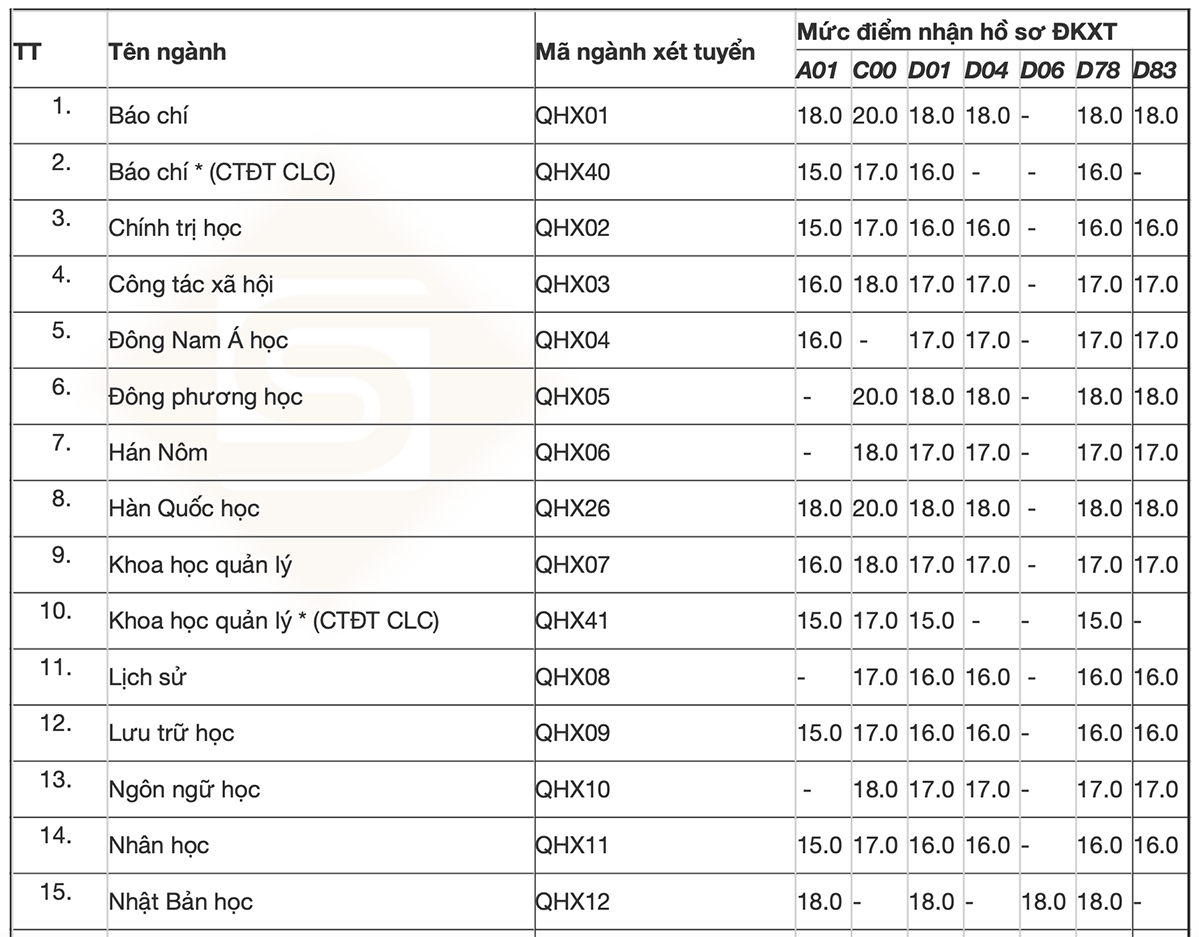 Năm nay, Đại học Khoa học Xã hội và Nhân văn tuyển 1.565 sinh viên theo kết quả thi tốt nghiệp THPT. Trường lấy điểm sàn từ 15 đến 20, tùy từng ngành và tổ hợp xét tuyển, cụ thể như sau: