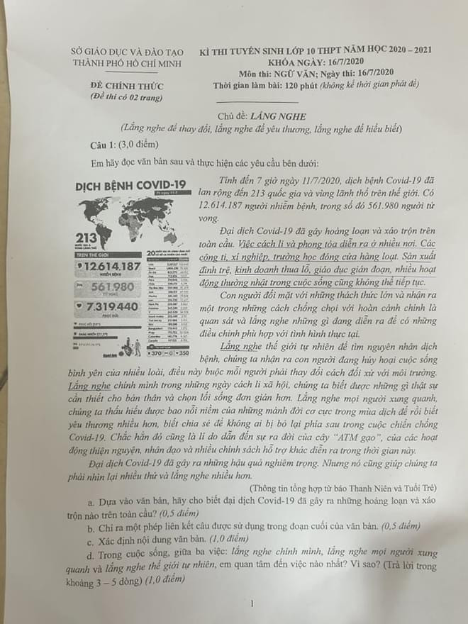 Trong phần đọc hiểu, đề bài đề cập tới vấn đề có tính thời sự, thực tế rất cao: Thế giới khủng hoảng vì đại dịch COVID-19 và vai trò của việc con người cần lắng nghe. Học sinh có thể vận dụng các kiến thức của mình về đại dịch đồng thời liên hệ với quan điểm riêng của mình để xử lí phần này.