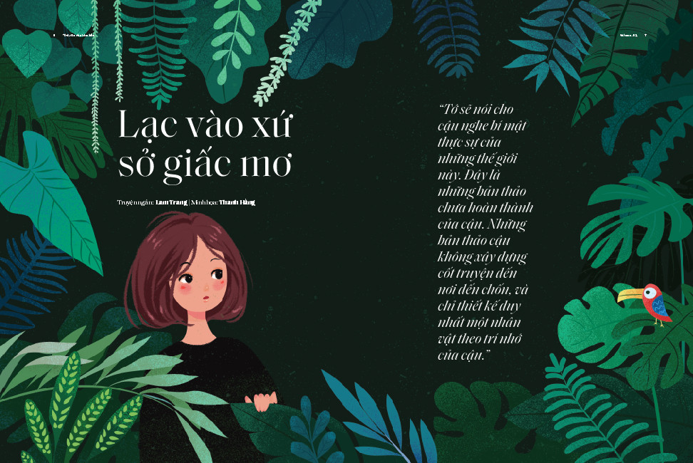 Người ta thường nói những giấc mơ phản ánh hiện thực, ngày nghĩ nhiều đêm sẽ mơ thấy. Thế nếu một ngày bạn không mơ nữa, mà trực tiếp rơi vào những giấc mơ mình tạo ra, thì sẽ như thế nào? Với ý tưởng thú vị đó, Lam Trang đã mang đến một câu chuyện mang màu sắc kì ảo, một cuộc phiêu lưu đầy mơ mộng, trong truyện ngắn Lạc vào xứ sở giấc mơ.