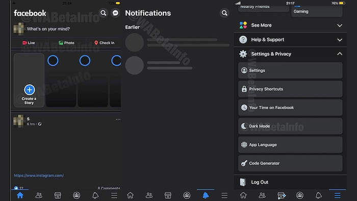 Cụ thể, một loạt ảnh chụp màn hình rò rỉ được WABetaInfo đăng tải mới đây cho thấy một giao diện hoàn toàn khác lạ trên Facebook khi kích hoạt chế độ tối. Để ý quan sát, bạn sẽ thấy giao diện tối của Facebook không phủ một màu đen hoàn toàn như Messenger, mà nghiêng về tông xám dịu mắt với điểm nhấn màu trắng ở phần chữ và logo biểu tượng.