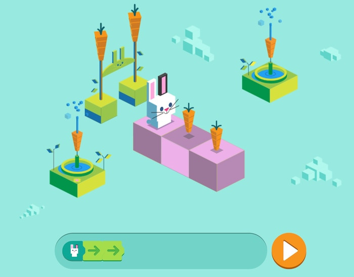 Khi chú thỏ phải rẽ, người chơi chọn ô ghép có hình quay và ấn nút màu cam để thỏ di chuyển. Đến chỗ khó hơn và dùng vòng lặp chạy. Cứ như vậy, cố gắng để thỏ thu được càng nhiều cà rốt càng tốt.