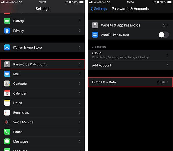 Trong phần Password & Accounts có một tính năng gọi là Fetch New Data. Click vào đây bạn sẽ thấy một vài lựa chọn nữa. Nếu đang đặt là Push, điện thoại liên tục kiểm tra xem có gì mới xảy ra không. Tính năng này tốn khá nhiều pin. Nếu đây là một chiếc điện thoại để làm việc, Push là một lựa chọn tốt. Tự động thu thập dữ liệu cũng là một tính năng tốt. Bạn có thể chọn thu thập dữ liệu theo thời gian hoặc làm thủ công.