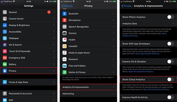 Để tắt tính năng này, bấm vào Settings > Privacy > Analytics > Tắt Share iPhone Analytics.