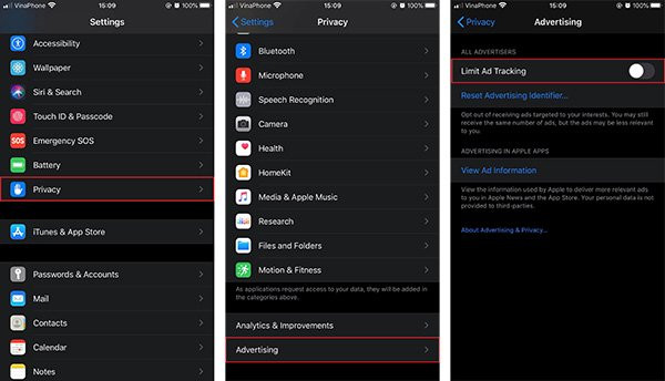 Tính năng giới hạn quảng cáo không được bật theo mặc định. Để bật lên, vào Settings > Privacy > Advertising > Bật Limit Ad Tracking.