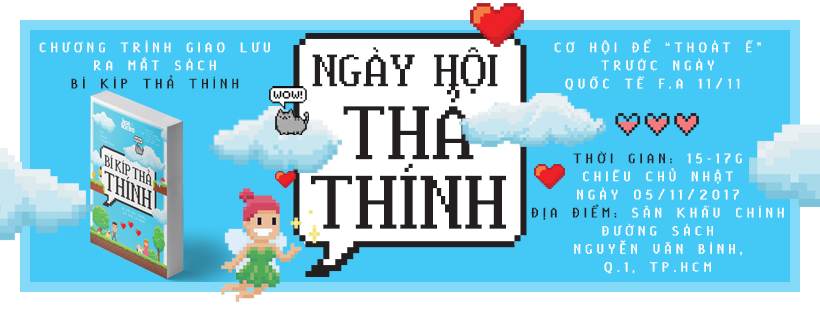 Tham dự buổi ra mắt sách Bí kíp thả THÍNH từ 15 - 17h chiều Chủ Nhật ngày 5/11/2017 tại sân khấu chính đường sách Nguyễn Văn Bình, Q.1, TP.HCM, bạn sẽ có cơ hội giao lưu cùng tác giả Châu Chặt Chém, nghe các admin của trang Thính Chất Lượng chia sẻ công thức chế biến “thính” cực phẩm để cầm cưa một ai đó.