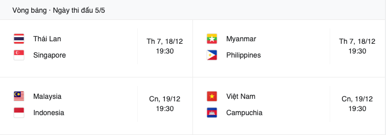LỊCH THI ĐẤU LƯỢT TRẬN CUỐI VÒNG BẢNG