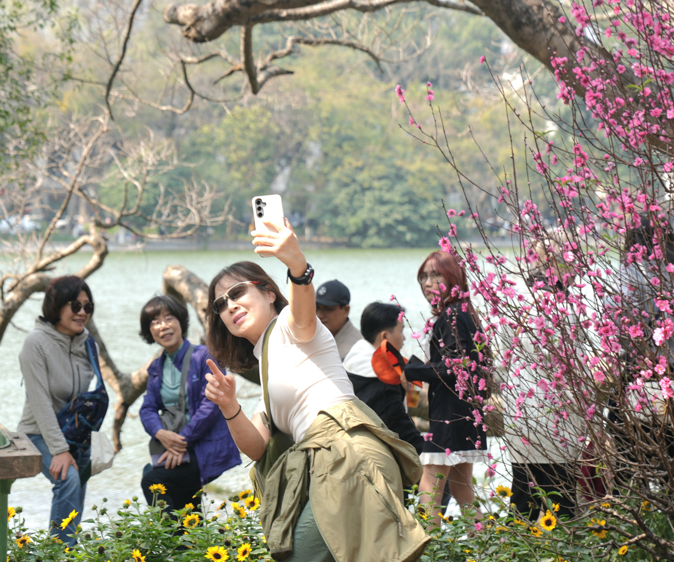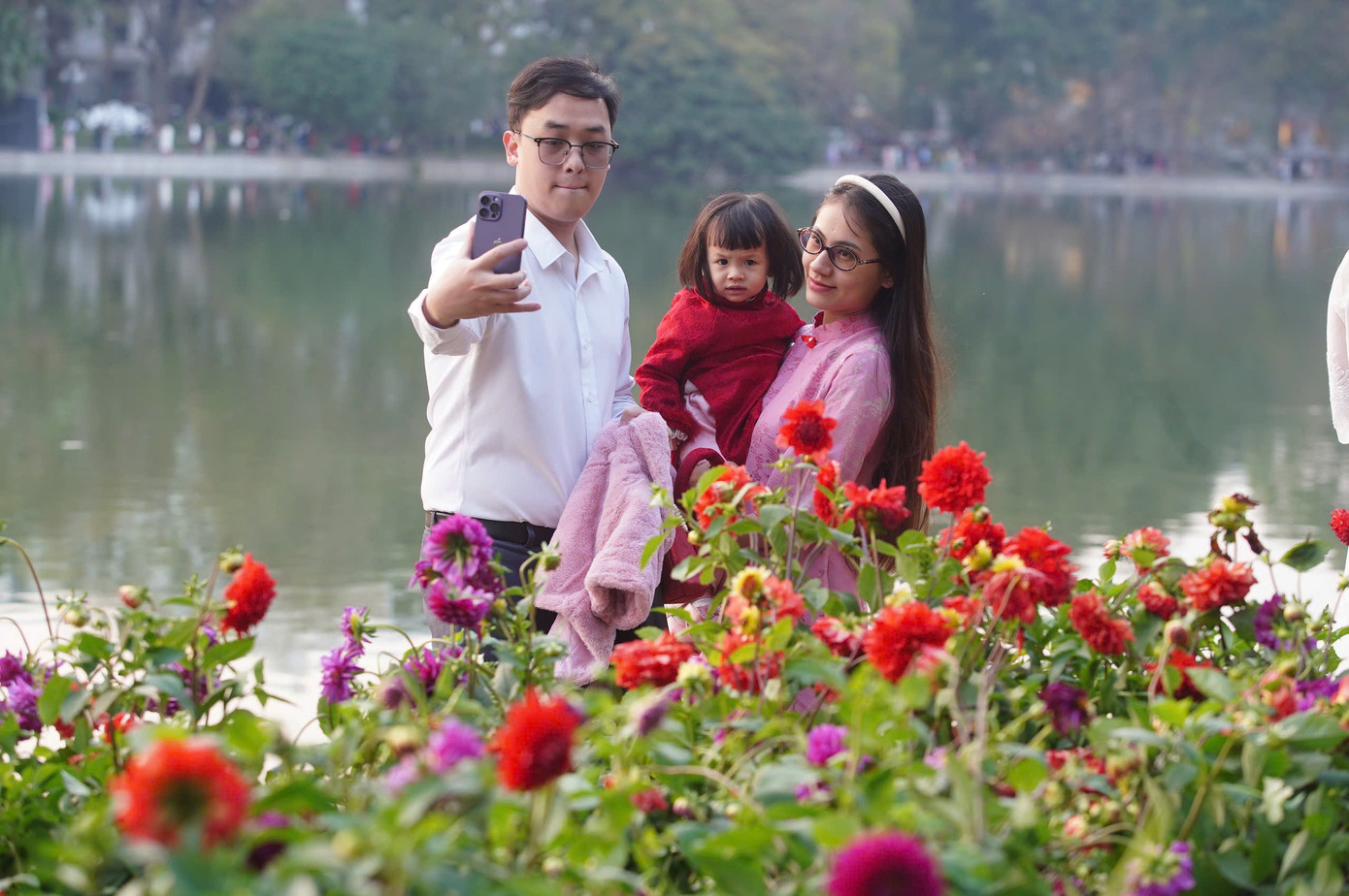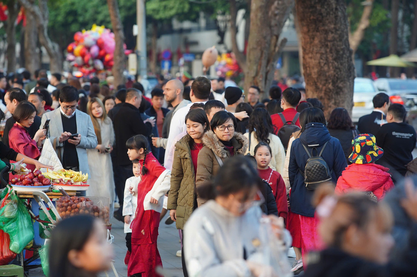 | Trưa Mùng 2 Tết, thời tiết Hà Nội có nắng ấm rực rỡ, nền nhiệt dao động khoảng 23-25 độ C. Nhiều gia đình, nhóm bạn xuống phố du xuân tận hưởng không khí thanh bình, tươi đẹp. |