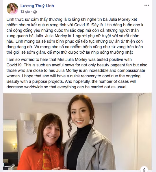 Hoa hậu Lương Thuỳ Linh cũng bày tỏ sự lo lắng trên trang cá nhân. Cô viết: "Linh thực sự cảm thấy thương là lo lắng khi nghe tin bà Julia Morley xét nhiệm cho ra kết quả dương tính với Covid-19. Đây là 1 tin đáng buồn cho k chỉ cộng đồng yêu những cuộc thi sắc đẹp mà còn cả những người thân xung quanh bà Julia".