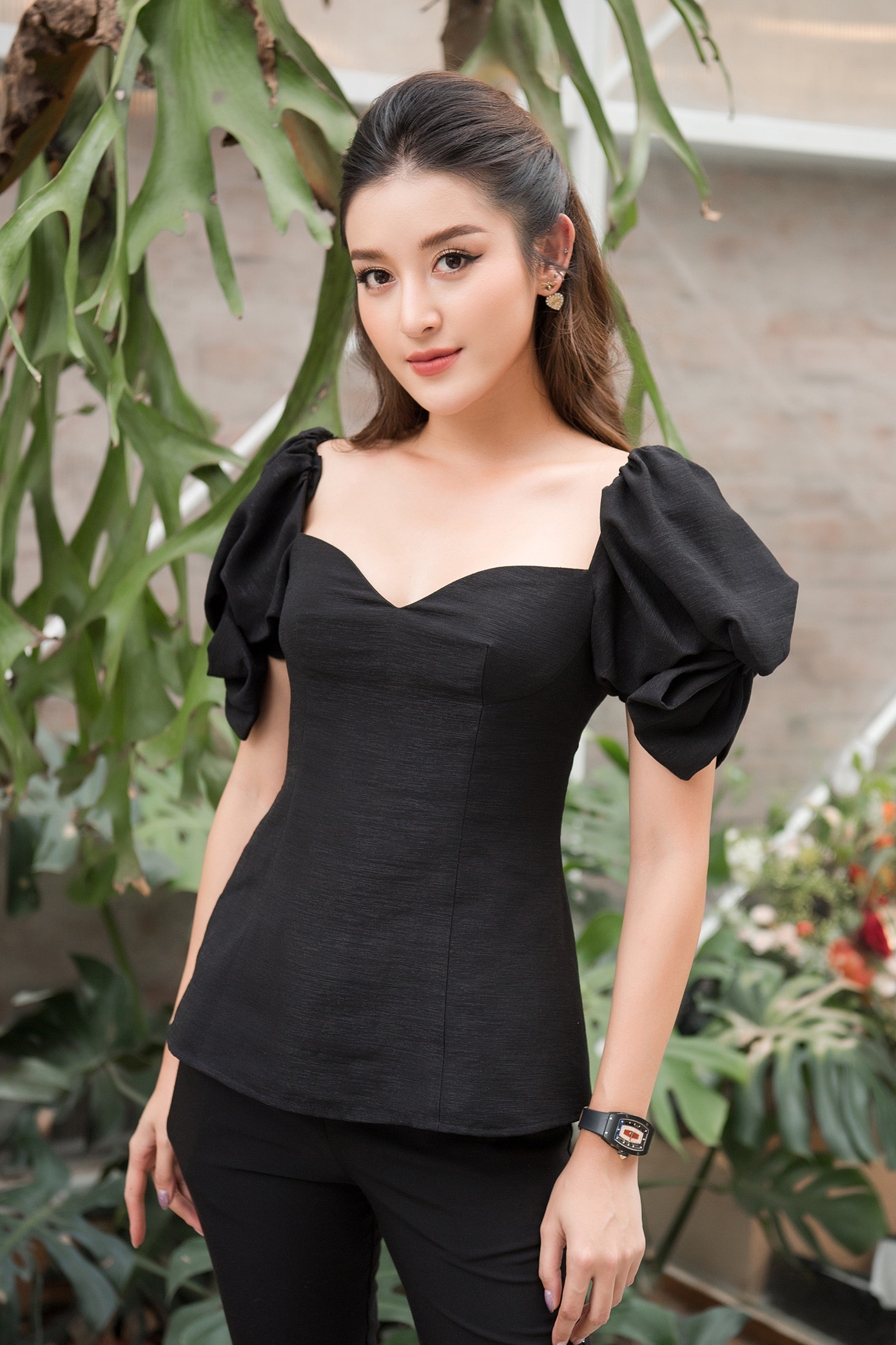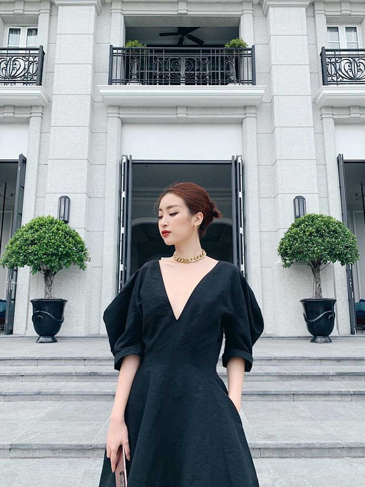 Tông màu đen giúp nàng hậu nhìn thon thả hơn. Cô cũng gây chú ý khi đeo trên tay chiếc đồng hồ hàng hiệu đắt giá có kiểu dáng lạ mắt.