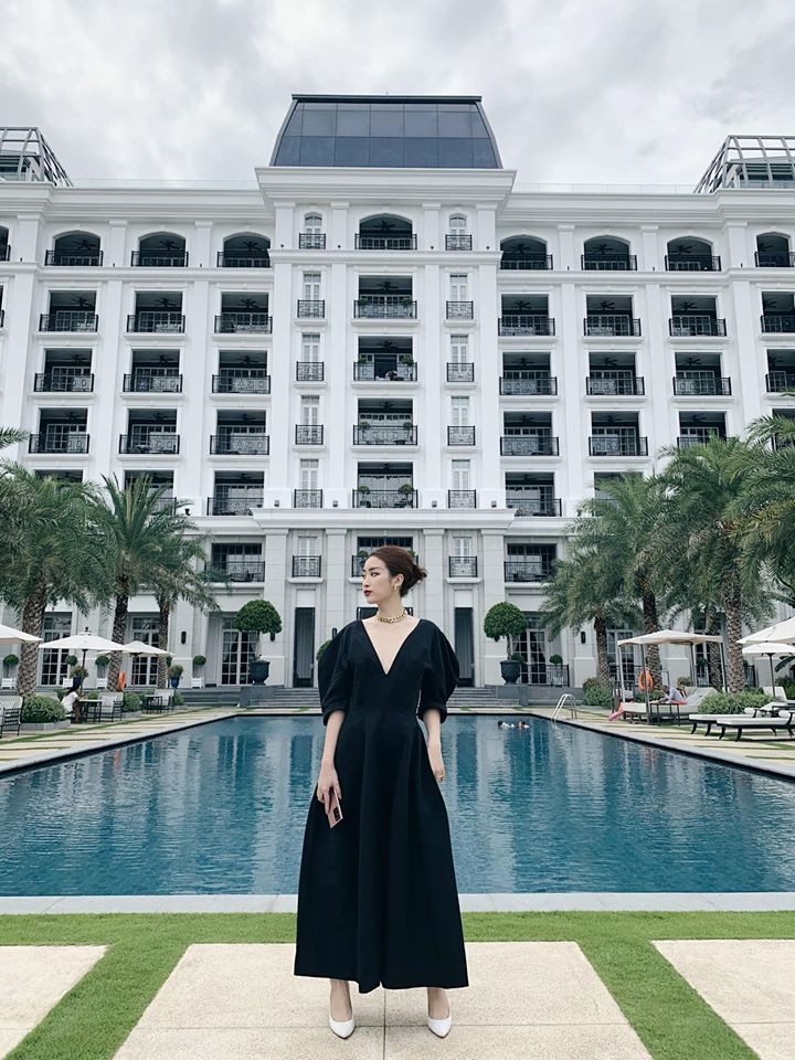 Hoa hậu Mỹ Linh diện váy cổ chữ V khoe vóc dáng gợi cảm.