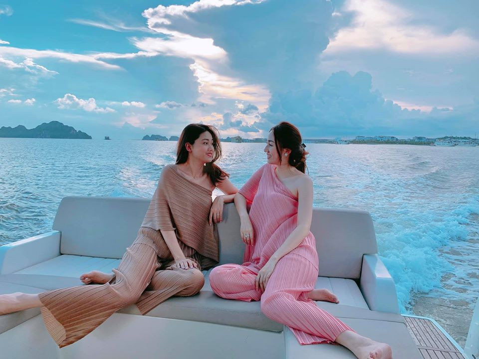 Hai chị em Á hậu Thanh Tú - Trà My khoe vai trần gợi cảm trên du thuyền.