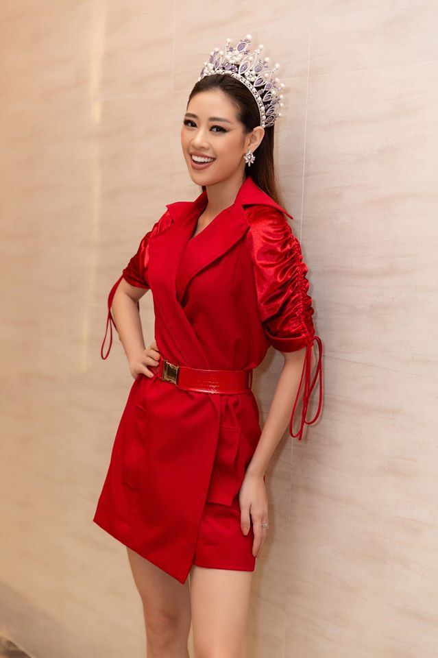 Hoa hậu Khánh Vân khoe vẻ cá tính và quyến rũ với bộ suit cách điệu màu đỏ, phối cùng boot đen quá gối.