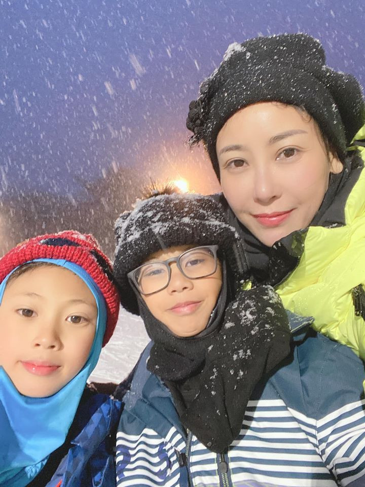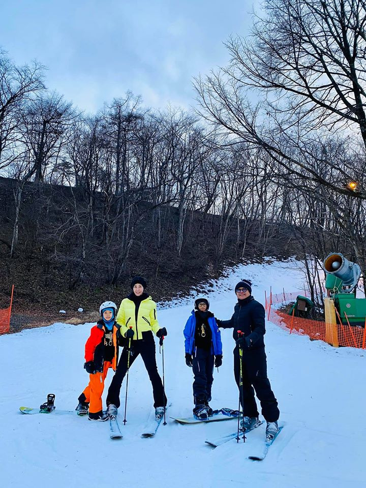 Hoa hậu Hà Kiều Anh cùng các con trượt tuyết ở Nhật Bản.