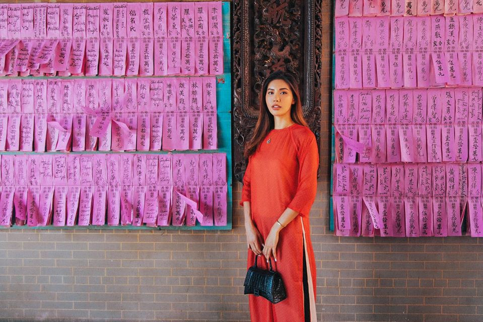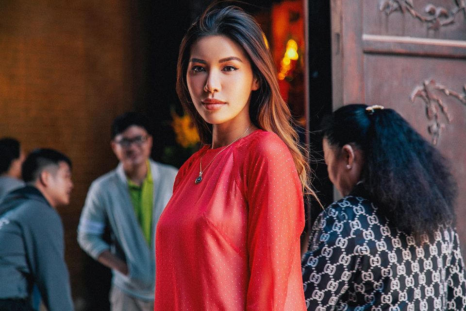 Hoa hậu Siêu quốc gia Việt Nam 2018 Minh Tú diện áo dài đỏ rực rỡ đi chùa đầu năm mới.