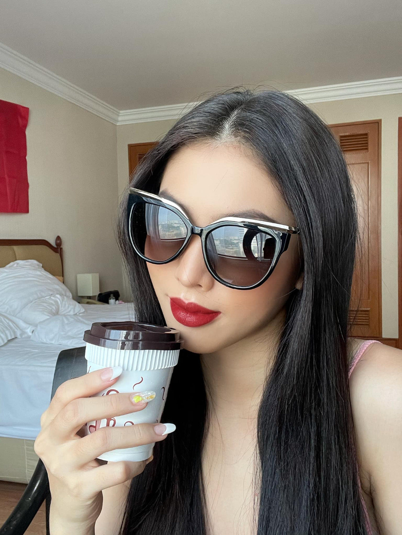 Á hậu Ngọc Thảo make-up xinh đẹp, sành điệu khi uống cafe bên trong khu cách ly ở Thái Lan.