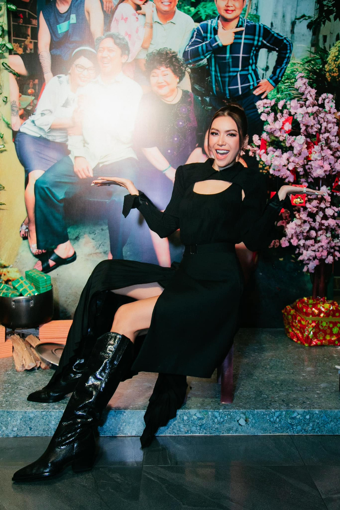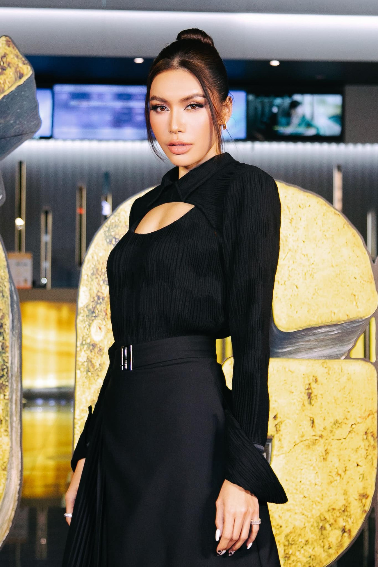 Minh Tú diện trang phục đen kín mít từ đầu tới chân nhưng vẫn có điểm nhấn quyến rũ nơi vòng 1.