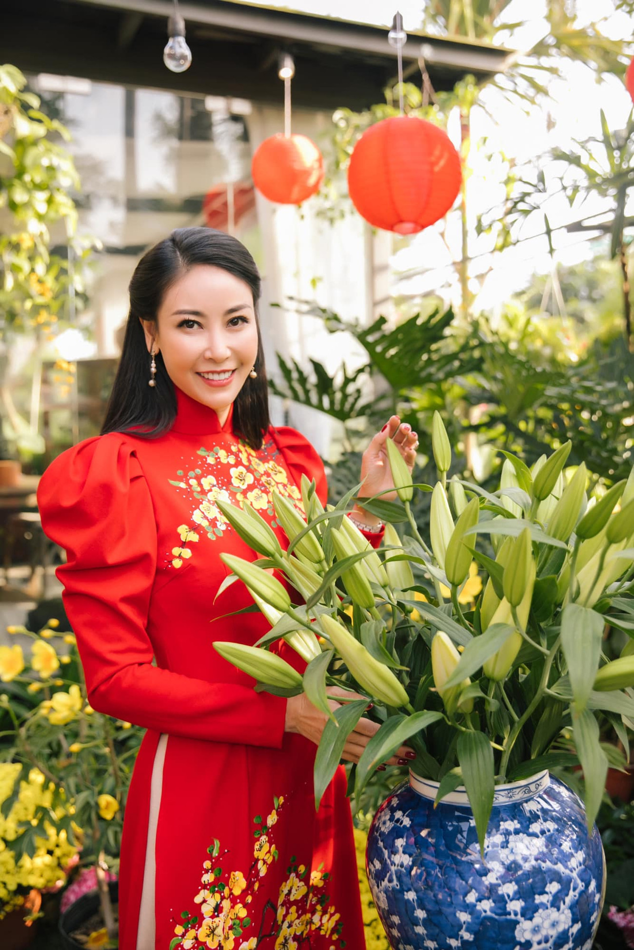 Hoa hậu Hà Kiều Anh đẹp mặn mà, duyên dáng khi diện áo dài Tết màu đỏ rực.