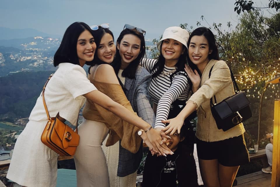 Hoa hậu Đỗ Mỹ Linh, Á hậu Diễm Trang, Hoa khôi Thuý Vi, người đẹp Thuỷ Tiên cùng chụp ảnh kỷ niệm theo phong cách "đưa tay lên nào, mãi bên nhau bạn nhé".