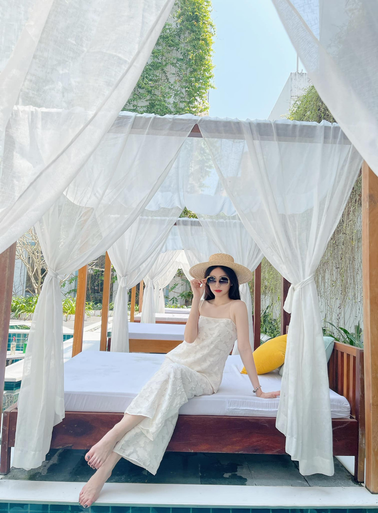 Á hậu Phương Nga khoe vai trần quyến rũ khi đi nghỉ dưỡng miền Trung.