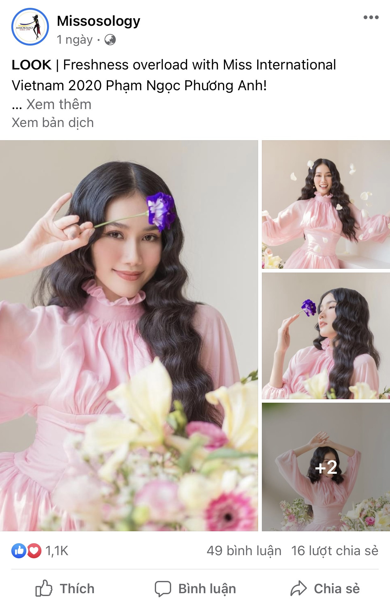 Cách đây 1 ngày, chuyên trang Missosology đã chia sẻ những hình ảnh mới nhất của Á hậu Phương Anh với vai trò đại diện Việt Nam tại Miss International 2021 và dành cho cô nhiều lời khen. Bài viết đã nhận được sự tương tác rất lớn từ cộng đồng fans sắc đẹp Việt Nam và quốc tế.